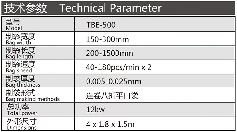 機器特性 此設備為生產連卷八折平口垃圾袋的專用設備,雙通道高速無拉伸底封好,收卷整齊,個數準確,手動手卷。主動放料,薄膜張力穩定此設備采用全鋼板一體而成,用電220v照明電即可。